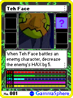 - Description: When Teh Face battles an enemy character, decrease the enemy's HAX by 5.